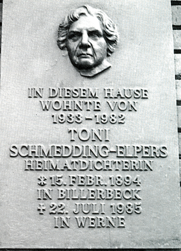 In Werne lebte weiterhin Antonia Schmedding-Elpers. Sie wurde 1894 auf dem Richthof in Billerbeck geboren. 1918 kam sie als junge Lehrerin an die Rektoratsschule nach Werne, wo sie bis 1940 Französisch und Englisch unterrichtete. Aus politischen Gründen schied sie aus dem Schuldienst aus. Ihre plattdeutschen Gedichte und Geschichten sind in dem Band Nu luster es zusammengetragen.