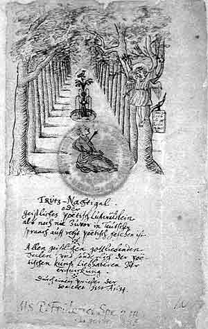 »TrutzNachtigal wird das Büchlein genand weil es trutz allen Nachtigalen so schön, und lieblich singet, und zwar auff recht Poetisch. Also da es sich auch wol bey sehr guten Lateinischen, und andern poeten dürffe hören lassen. Dan da auch in der Teutschen Spraach man gut poetisch dichten, und reden könne; und es nicht bi hero an der Spraach, sondern an poeten, so es einmahl auch im Teutschen wagen dürfften, gemanglet habe; wird der Leser gleich aus disem Büchlein erfahren.« – Die »Trutznachtigall« steht am Beginn der neueren deutschen Metrik. Ihre Naturlyrik gehört zum Besten der Barockzeit. Verfasst wurde sie von dem Jesuiten Friedrich Spee von Langenfeld (*1591 Kaiserswerth bei Düsseldorf, † 1635 Trier). Seine ersten Kirchenlieder (u.a. »O Heiland, reiß die Himmel auf«) erschienen 1621/22. Von 1623 bis 1626 wirkte Spee als Philosophieprofessor an der Universität Paderborn und dort seit 1629 als Professor für Moraltheologie. 1631 wurde ihm die Lehrbefugnis entzogen. Im selben Jahr erschien seine »Cautio Criminalis. Rechtliches Bedenken wegen der Hexenprozesse«, die ihm viele Anfeindungen einbrachte. In dieser Schrift entlarvt er in 50 Fragen und Antworten die unlauteren Praktiken der Prozessführung. Das Buch trug wesentlich zur Abfassung der Hexenprozesse bei, die in Westfalen stark verbreitet waren. Die Entstehung des »Trutznachtigall« reicht bis in diese Paderborner Zeit zurück. In diesem Liederbuch stellt Spee seine in Deutsch geschriebenen Texte selbstbewusst neben die lateinische Dichtung der Zeit und die des eigenen Ordens (Jesuitendramen). Spees Lieder sind noch heute in Kirchen-Gesangbüchern weit verbreitet.Mit der »Trutznachtigall« verfolgte Spee auch seelsorgerische Ziele. Er wusste, wie nützlich und fruchtbar Gesang und Poesie für Katechese und Glaubensunterweisung sein konnten, wenn die Menschen auch tatsächlich verstanden, was sie sangen. Die weite Verbreitung und Wirkung des Werks zeigt sich darin, dass es Übersetzungen einzelner Teile ins Italienische, Tschechische und Lateinische gab. Bis zum Beginn des 18. Jahrhunderts erschienen 6 Auflagen. Starke Nachwirkungen zeigte Spees Lyrik in der Romantik: Friedrich von Schlegel und Clemens Brentano brachten Neuausgaben heraus und fünf Lieder fanden Eingang in »Des Knaben Wunderhorn«.