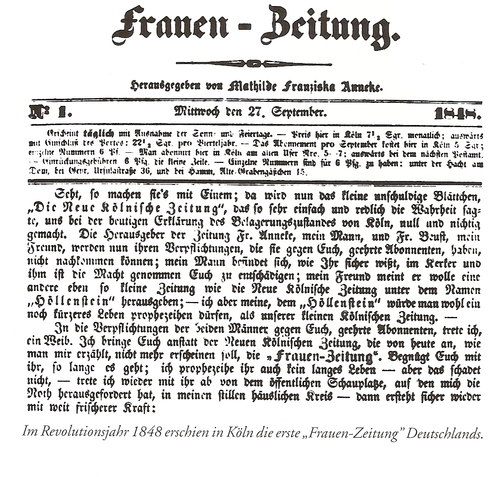 Mathilde Franziska Anneke: Frauen-Zeitung Die literarische Laufbahn Mathilde Franziska Annekes, geb. Giesler, in erster Ehe verheiratete Tabouillot, nahm eine ungewöhnliche Wende. Aus einer katholischen Erbauungs- und Unterhaltungsschriftstellerin wurde eine Freidenkerin, die sich aktiv an der Revolution beteiligte, 1849 in die Vereinigten Staaten auswanderte und zu einer der profiliertesten Gestalten der deutschen Frauenrechtsbewegung wurde. Die Autorin entstammte der rheinischen Oberschicht. Nach einer früh geschlossenen, unglücklichen Ehe mit dem Weinhändler Alfred von Tabouillot ließ sie sich in Wesel und später in Münster nieder. Um ein Auskommen zu finden – zwei Gnadengesuche an den preußischen König wurden später abgelehnt –, besann sie sich auf ihr literarisches Talent und wurde unter anderem Mitarbeiterin der »Kölnischen Zeitung«, der Augsburger »Allgemeinen Zeitung« und des Cotta’schen »Morgenblattes«. 1839/1940 gab sie in Wesel zwei Gedicht- bzw. Gebetbücher heraus. Hierauf wandte sie sich Anthologieprojekten zu. Es erschienen »Der Heimatgruß. Eine Pfingstgabe« (1840), ein »Damen-Almanach« (1842) und die »Producte der Rothen Erde« (1846). Mit diesen Unternehmungen versuchte sie, die poetischen Kräfte Westfalens zusammenzuführen. Unter den Mitarbeitern waren Ferdinand Freiligrath, Levin Schücking und Annette von Droste-Hülshoff. Durch die Bekanntschaft mit ihrem späteren Mann, Fritz Annecke, wurde aus der schwärmerischen Katholikin eine entschiedene Freidenkerin, die vor keiner Konsequenz der neuen Weltanschauung zurückschreckte. In Münster wurde sie damals als »Communisten Mutter« denunziert. 1847 zog sie mit ihrem Ehemann nach Köln und stand dort im Mittelpunkt der demokratischen Bewegung. Der »Salon Anneke« war eine der Keimzellen der Revolution des Jahres 1848/49. Hier erschien M.F. Annekes Programmschrift »Das Weib im Conflict mit den socialen Verhältnissen«. Damals regte die Verfasserin die Gründung der »Neuen Kölnischen Zeitung« (erste Ausgabe am 10. September 1848) an. Als das Blatt wegen ihrer Radikalität verboten wurde, führte sie es als »Frauen-Zeitung« weiter. Zu einem Höhepunkt ihres politischen Wirkens wurde 1849 die aktive Teilnahme des Ehepaares am badisch-pfälzischen Feldzug. Nach dem Scheitern der Revolution flohen sie als »Forthy Eighter« nach Amerika, wo sie ihr frauenrechtliches Engagement fortsetzte.